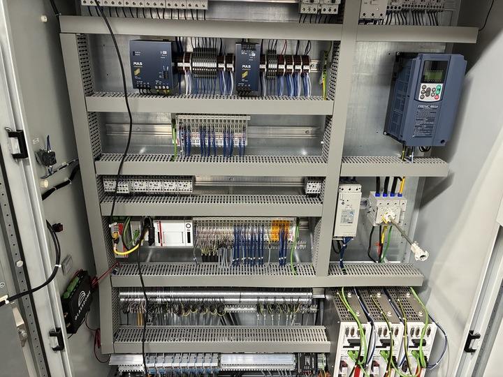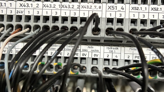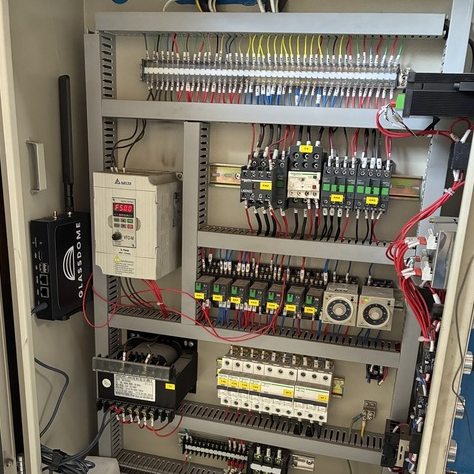 The client requested that we monitor this bender for uptime, downtime, and part counts. Similar to the other machine, we had no way to directly interact with the computer within this machine. After reviewing the schematics, we found that relay KA4 will close or allow voltage to flow once the machine starts a cycle or begins to produce a part. A limit switch controls KA4. When the machine begins a cycle, it will strike the limit switch, energizing it, before committing to a part. Utilizing the motor that powers the system would have been easier, but it is a hydraulic-based system, meaning the motor is always running, but that does not mean the machine is actually producing parts. By wiring the Vout into the input side of the relay and wiring the output side of the relay to DIN1+ we can see when the limit switch is activated, thus being able to know when a cycle has started and the total number of cycles.